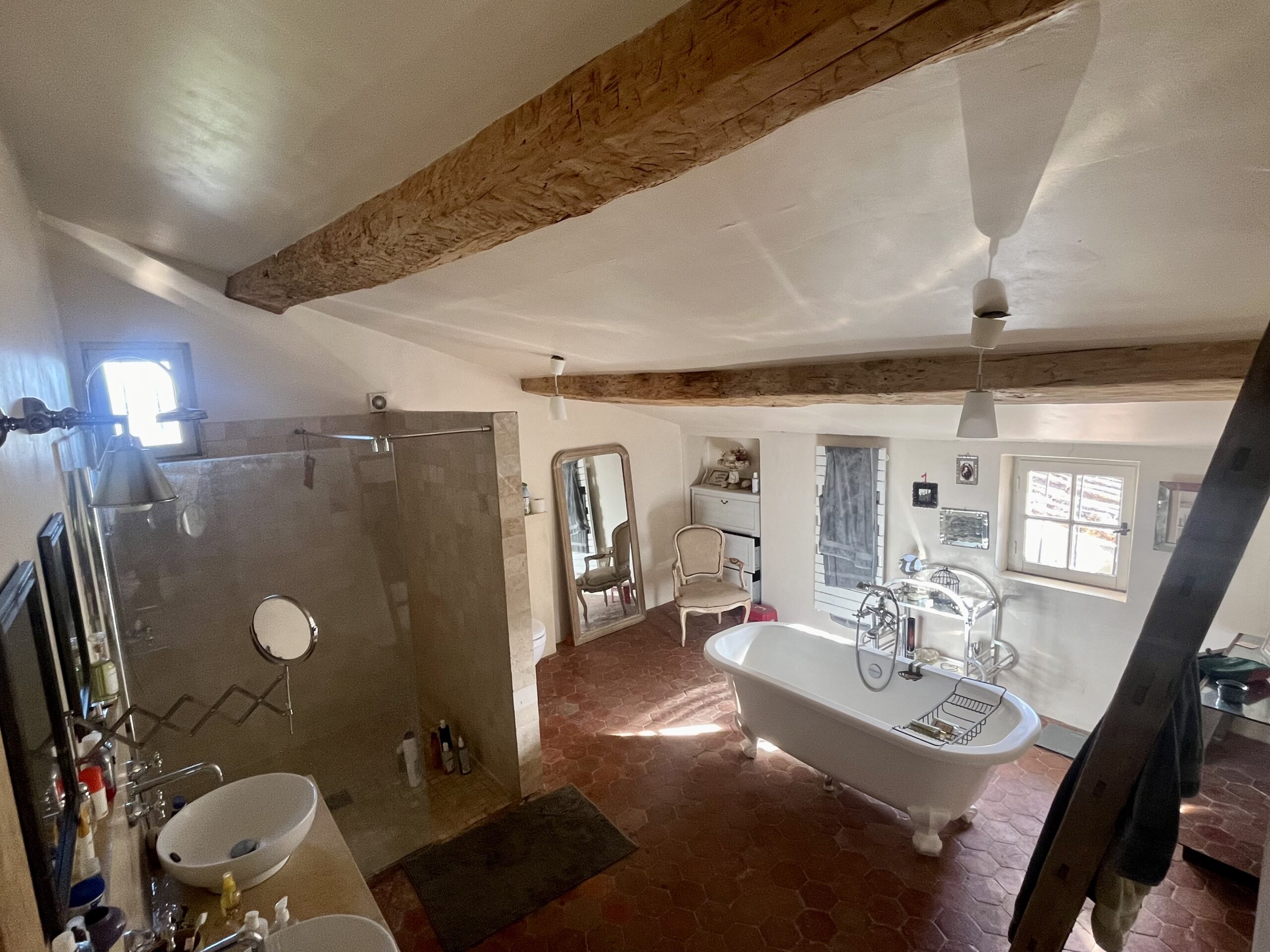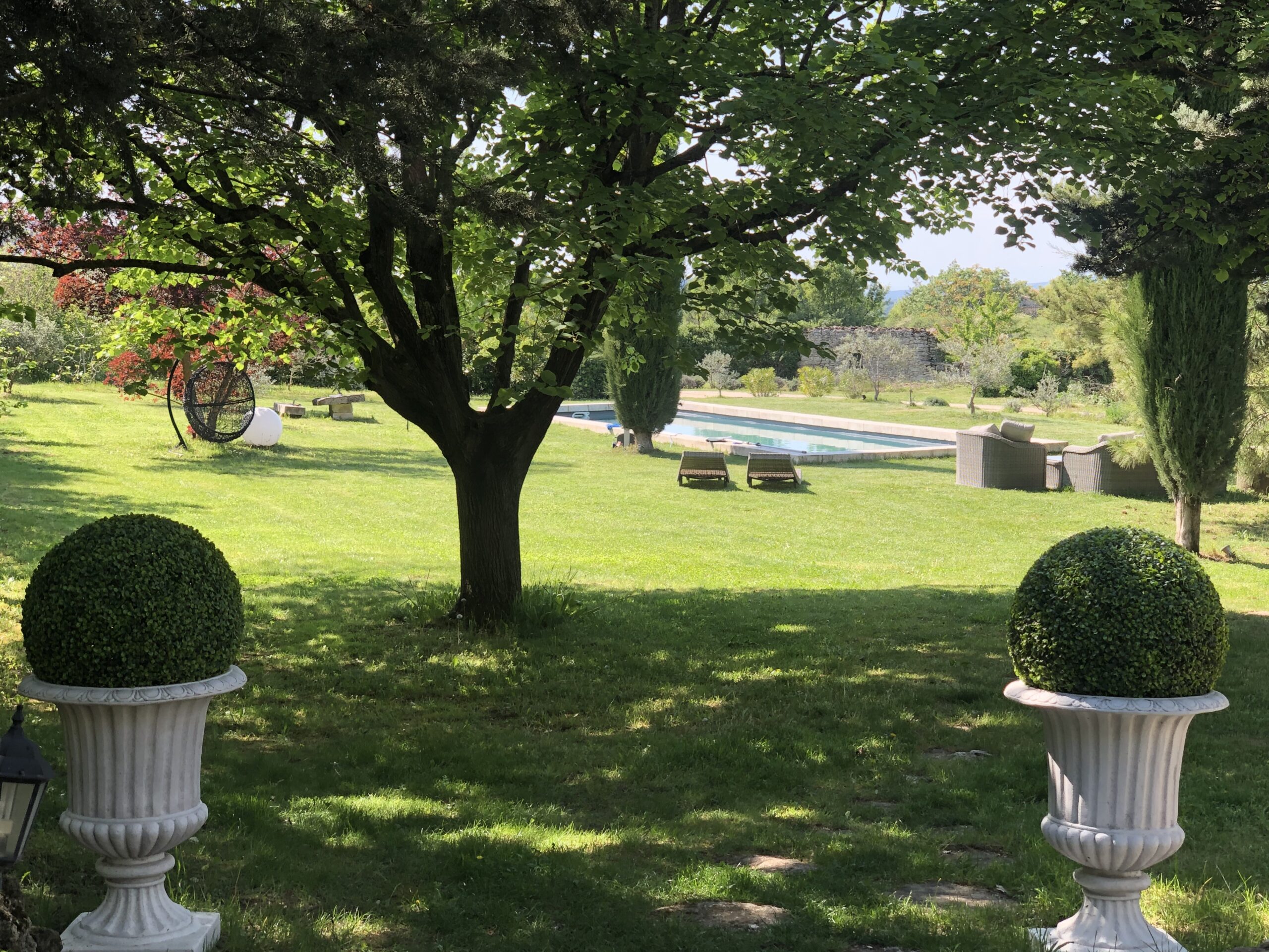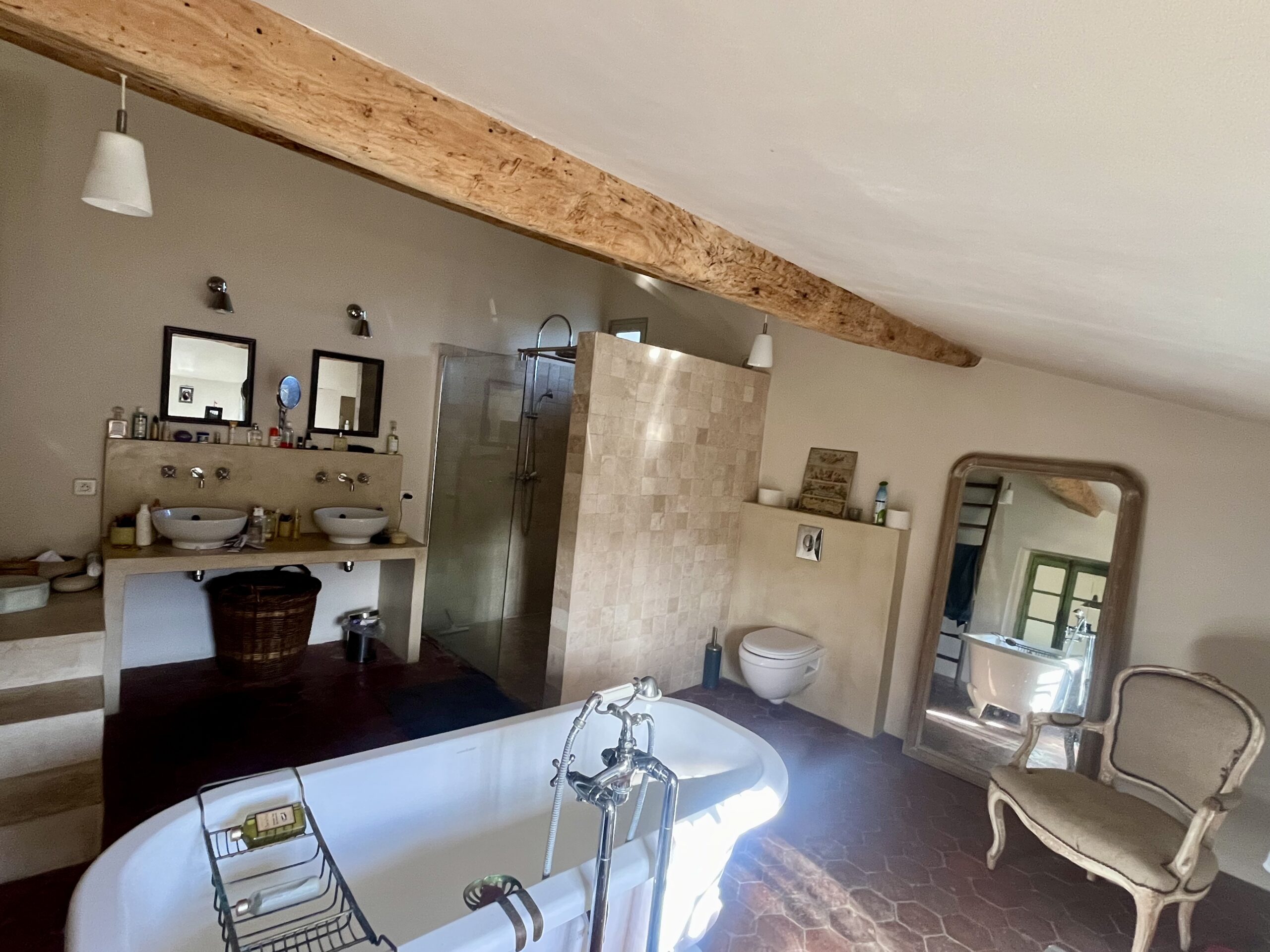 Idéalement situé à 1 km du magnifique et authentique village de Bonnieux, dans un cadre idyllique entre vignes et cerisiers, sans aucune nuisance et avec de très belles vues sur le Mont Ventoux et les villages de Lacoste, Roussillon, Gordes.., très beau mas totalement indépendant dans propriété datant de 1718, avec bassin de nage de 4 X 15 mètres sur beau terrain comprenant : en rez de jardin : très bel espace de vie de 60 m2 (salon salle à manger, cuisine ouverte), salle de douche avec wc, une chambre; puis au 2ème étage par escalier intérieur 3 chambres indépendantes avec vue sur Lacoste et le mont Ventoux, très belle salle de bains de 17 m2 avec grande douche, baignoire, double vasque, wc suspendus et tommettes anciennes au sol. Les beaux matériaux anciens donnent un charme indéniable à la propriété : tomettes anciennes, travertin, poutres… Terrasse avec barbecue, pièce dédiée au tennis de table… Autres logements possibles selon disponibilité dans la propriété, voir dernière photo pour une meilleur compréhension…